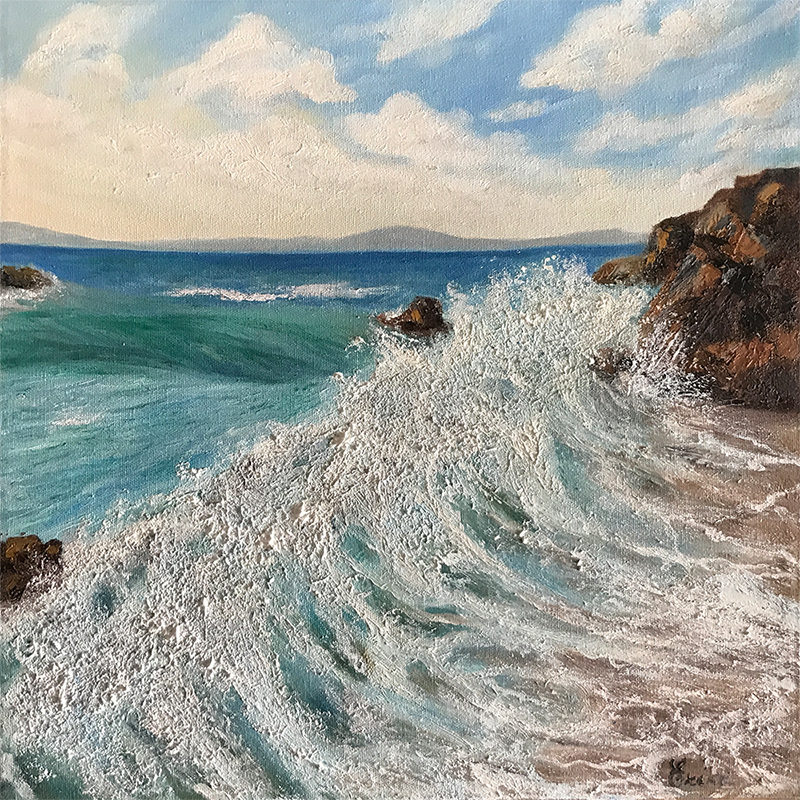 “Approaching Storm” is an emotional portrayal of strength and freedom, captured through a herd of wild horses galloping along the shoreline as a dramatic storm brews in the distance. I used oil on canvas to contrast the serenity of the sea with the powerful motion of the horses and the turbulent sky, highlighting nature’s raw energy and beauty.