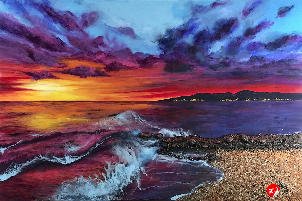 When I began painting Into the Storm, I could almost feel the salt spray on my face and hear the thunderous crash of the waves. I wanted to capture that raw, unfiltered moment when nature shows its full power and beauty—a point where the sea feels both alive and unpredictable. The fishing boat in the distance became my focal point, a symbol of human resilience, determination, and maybe even stubbornness. The fiery sky breaking through the heavy clouds hints at hope and survival, even as the waters churn violently below.