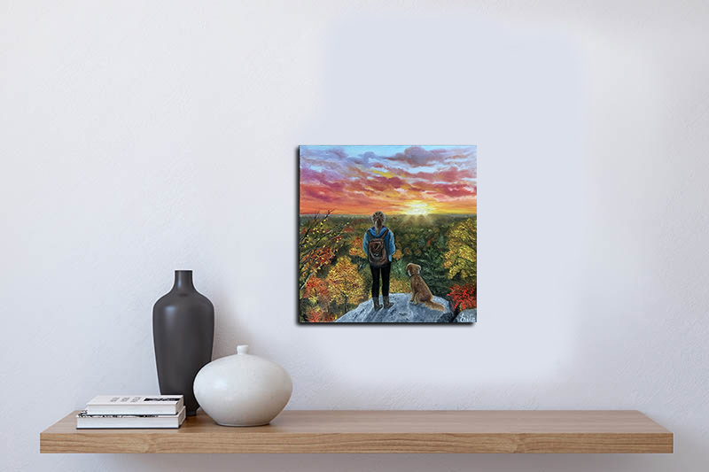 When creating the paintings, I was inspired by the bond between humans, their animal companions, and the natural world. This piece reflects those rare, perfect moments when we pause from life’s journey to simply stand still, breathe deeply, and take in the beauty around us. It is about gratitude—for the vastness of nature, for the warmth of a setting sun, and for the loyal presence of a friend who shares the path.