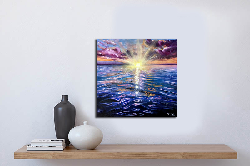 This painting, Setting Sun, was born from a moment of awe — one of those evenings when the sun seemed to melt into the water, casting light like a blessing across the waves. I had been watching the horizon, not for inspiration, but for peace. The world felt loud that day, and the water’s rhythmic motion offered a kind of stillness that I desperately needed.