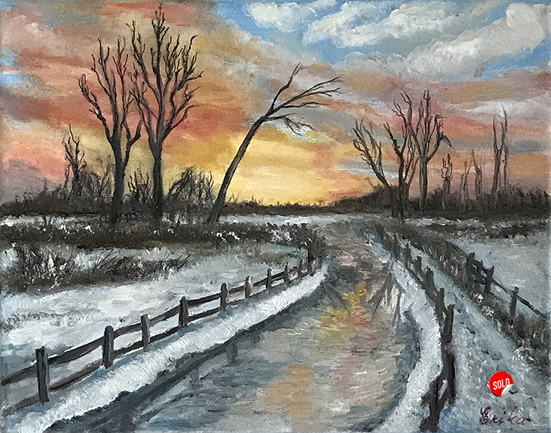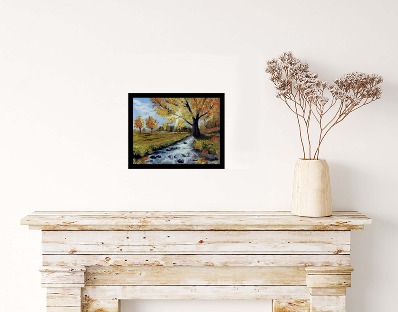 This painting was made with oil paints on canvas and is framed in a black floating frame.