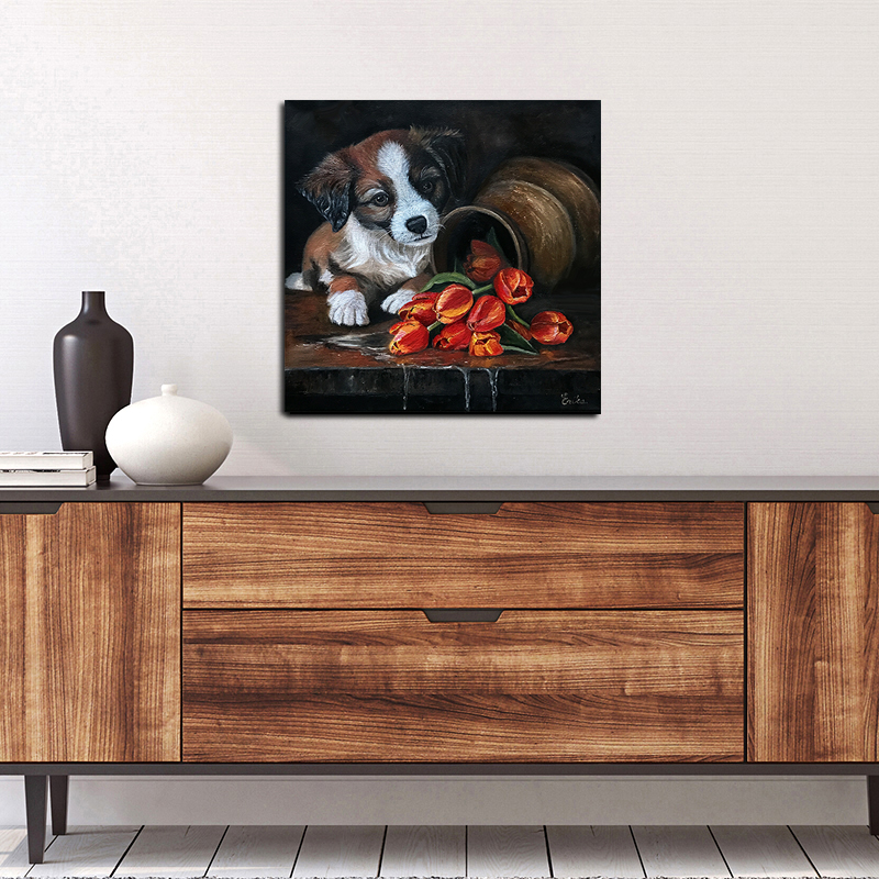 My oil painting, titled “The Cat Did It!”, captures a moment of playful mischief that I found both charming and humorous. The soft fur of the dog and the delicate texture of the petals were especially fun to bring to life with my brushwork. I included a small puddle of water to hint at the recent tumble and add a bit of storytelling to the scene. For me, this piece blends elegance with a touch of lightheartedness, and I hope it makes you smile.