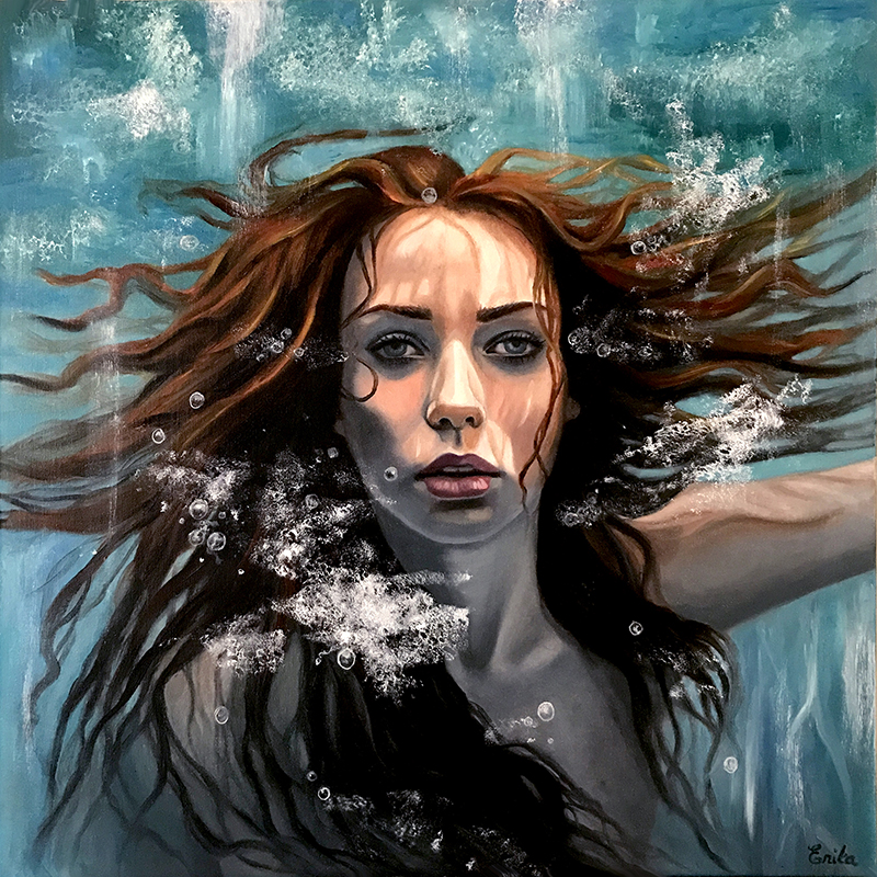 Painting this was both a technical and emotional journey. I was fascinated by the challenge of portraying the way light dances through water, how bubbles form, and how hair and skin take on a different life beneath the surface. But more importantly, I wanted to honor the invisible strength of maternal love — how it allows a child to feel safe enough to let go and explore.
