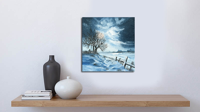 This painting was inspired by the quiet, reflective beauty of winter nights. There’s something hauntingly peaceful about standing under a moonlit sky, where the only sound is the whisper of falling snow. The barren tree symbolizes endurance and strength through the coldest, loneliest moments, while the soft blues and silvers capture the calm and melancholy of the season.