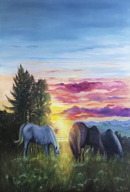 When creating this landscape, I wanted to illustrate the peaceful aftermath of a storm. A bold, vibrant rainbow arcs gracefully across the sky, emerging from clouds that are beginning to clear. The rainbow’s colors contrast against the storm’s remnants, creating a sense of hope and renewal.